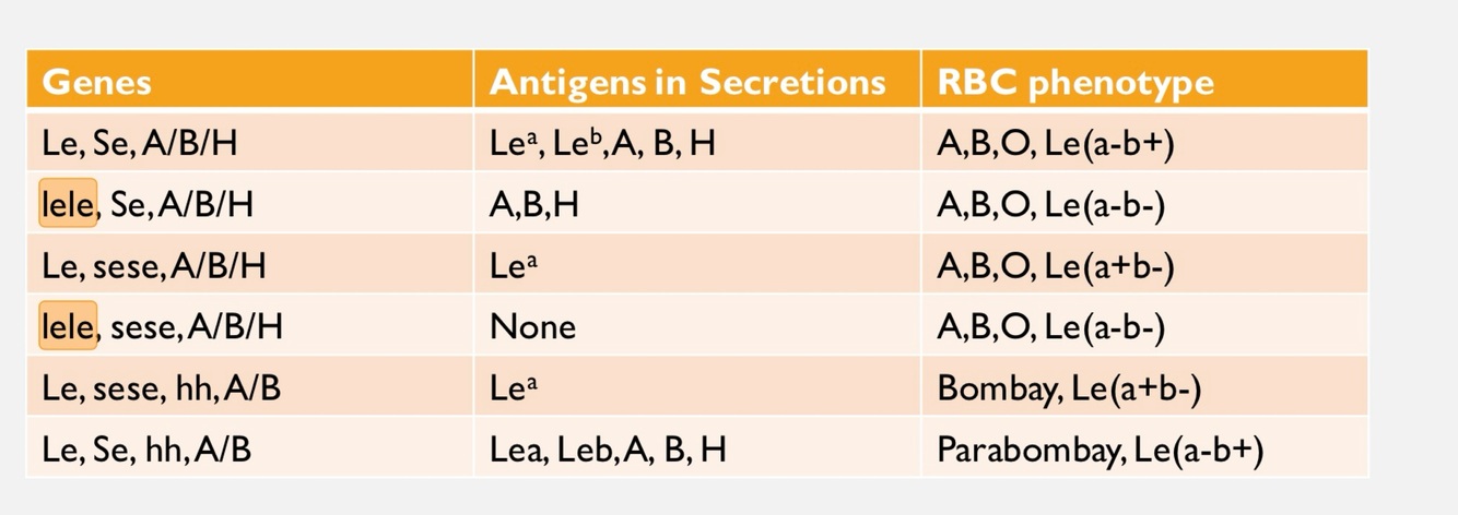 A patient with hh, LeLe, sese, A genes will express what antigens on their red cells?