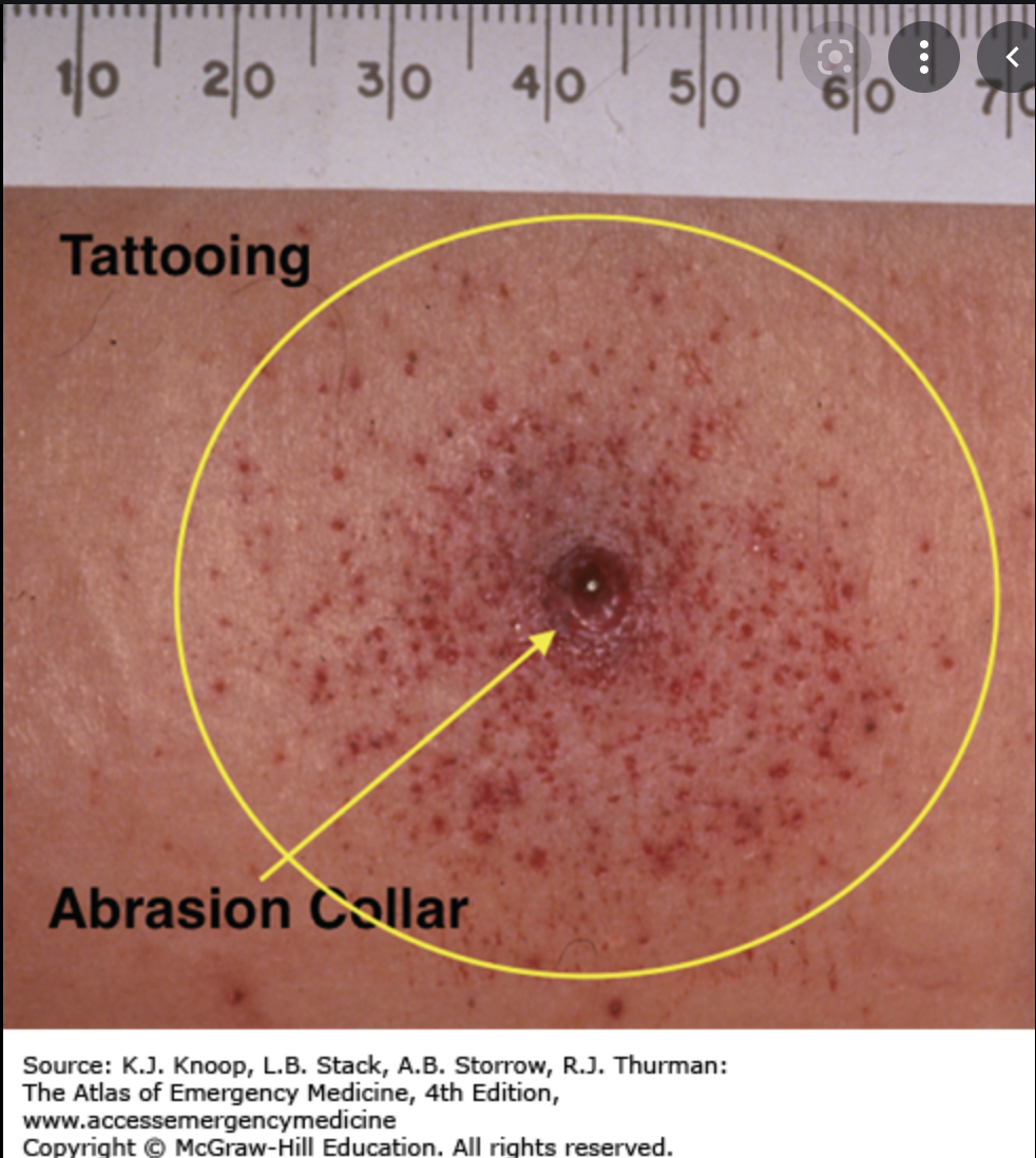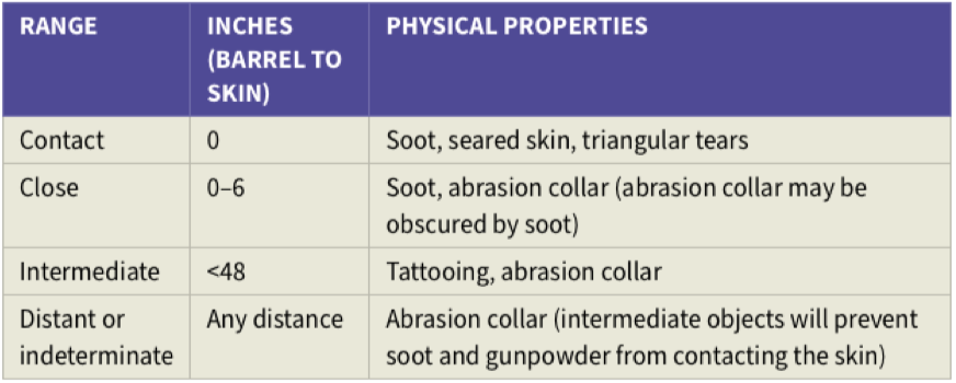 Contact avec la peau (0 pouce): déchirure triangulaire de la peau, ecchymose ayant la forme du museau du fusil, suie et peau brûlée