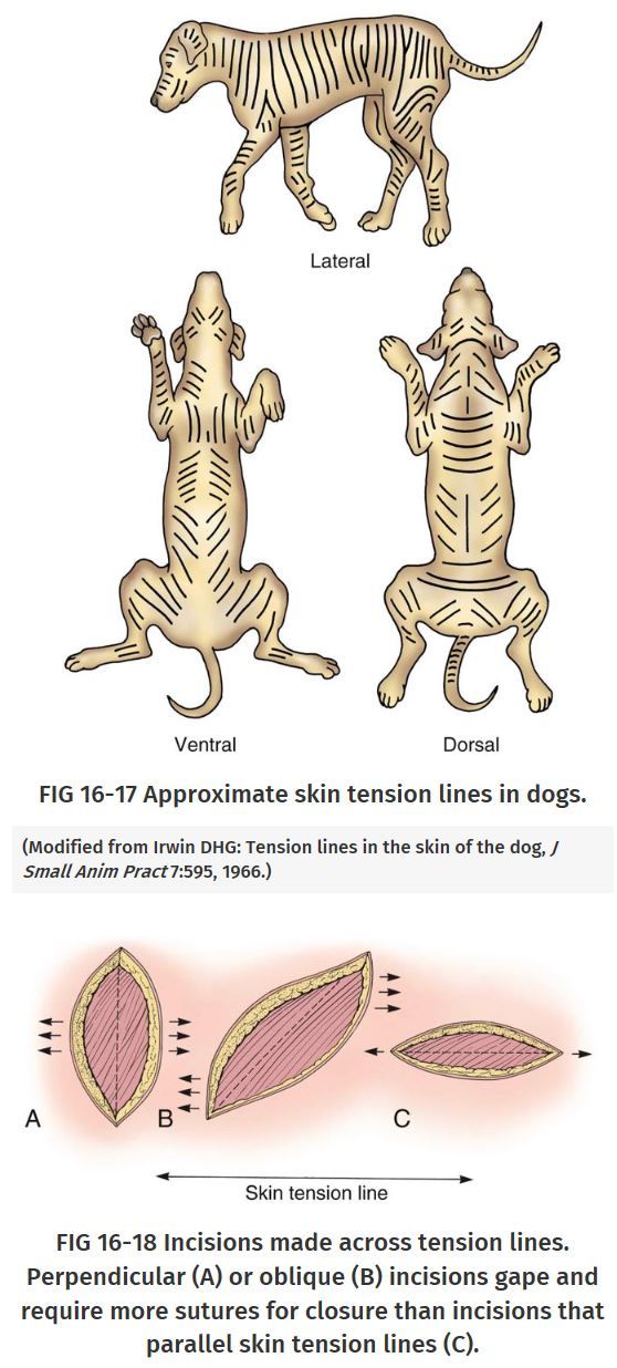 Must orient along tension lines (longitudinally) and in a direction that won’t increase the surgical field for the second surgery