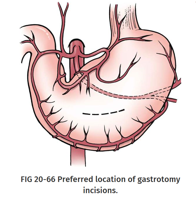 Incision in hypovascular aspect of stomach between greater and lesser curvature