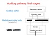 MEDIAL GENICULATE BODY- THALAMUS. WHICH DIVISION? Polimodal integration areas Auditory afferences (IC cortex), but also afferences from other modalities Projects to secondary auditory cortex and associative areas