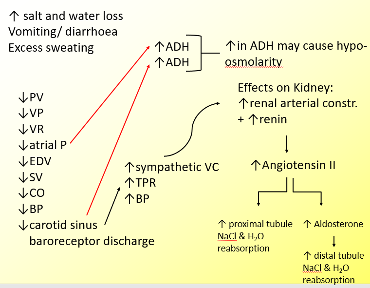 Causes increase in sympathetic discharge -> increase vasoconstriction -> increased total peripheral resistance -> increased blood pressure towards normal