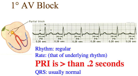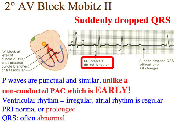 Mobitz type2 occasional no conducted beats Wenckeback progressive lengthening of the PR interval, then no conducted p wave, followed by repetition of cycle 2:1 or 3:1 block 2 or 3 p waves per QRS