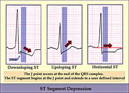Digoxin: ST slopes downwards depression Ischaemia: ST flat segment depression