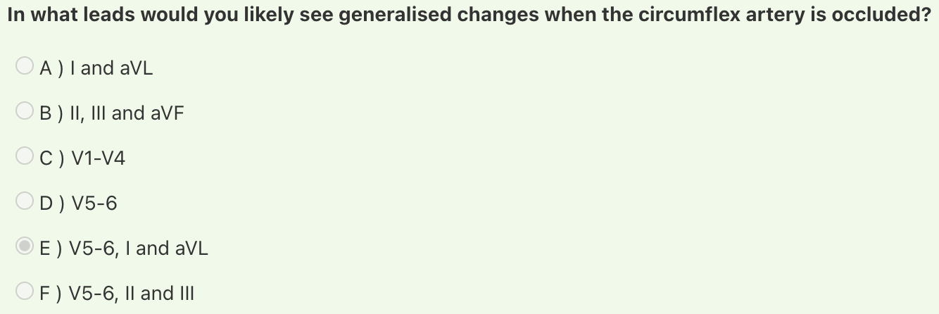 The circumflex artery supplies the posterior and lateral walls of the left ventricle and thus ECG changes manifest in V5-6, I and aVL.