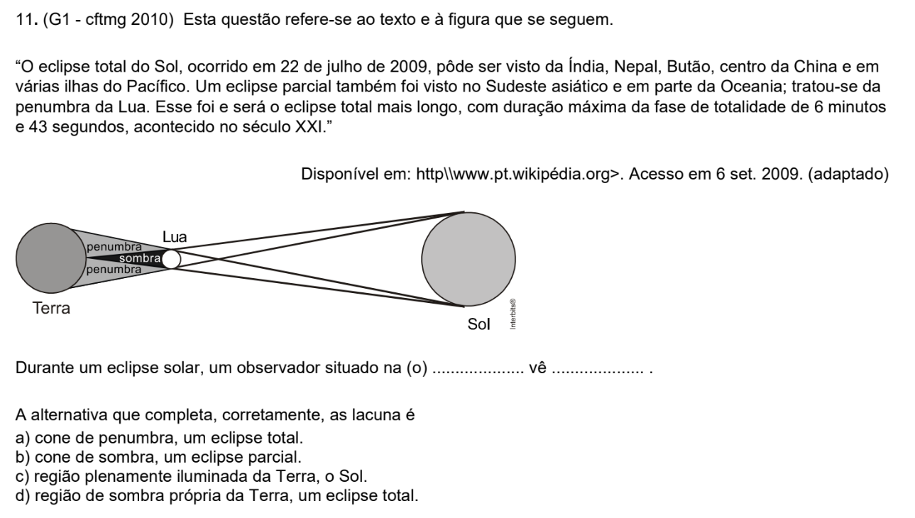 Em um eclipse solar, um observador localizado em um cone de sombra observa qual tipo de eclipse solar ?