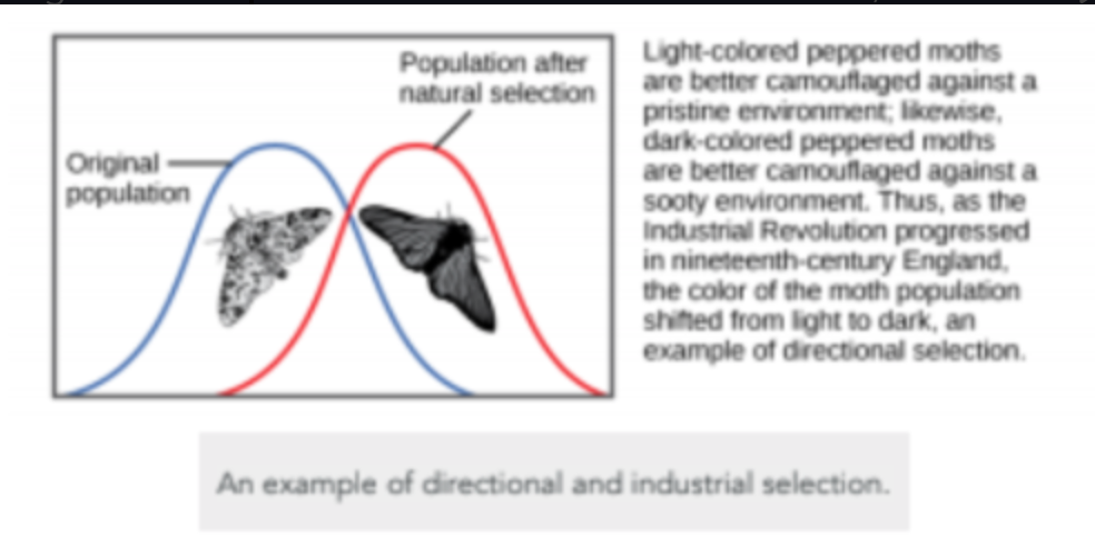 the selection of dark coloured, melanic, varieties in various species of moths as a result of industrial pollution (type of directional selection)
