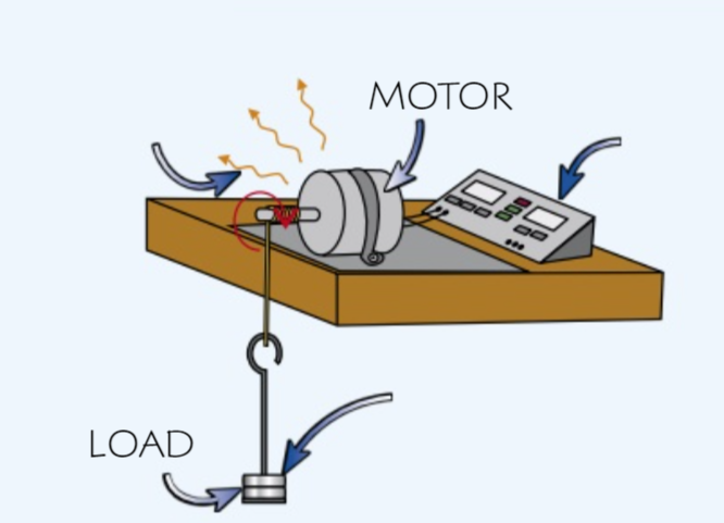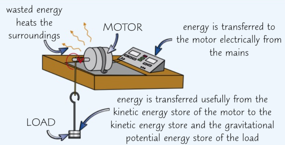 Energy is wasted when the motor transfers energy mechanically to the thermal energy stores of its moving parts, heating the surroundings as the energy is dissipated