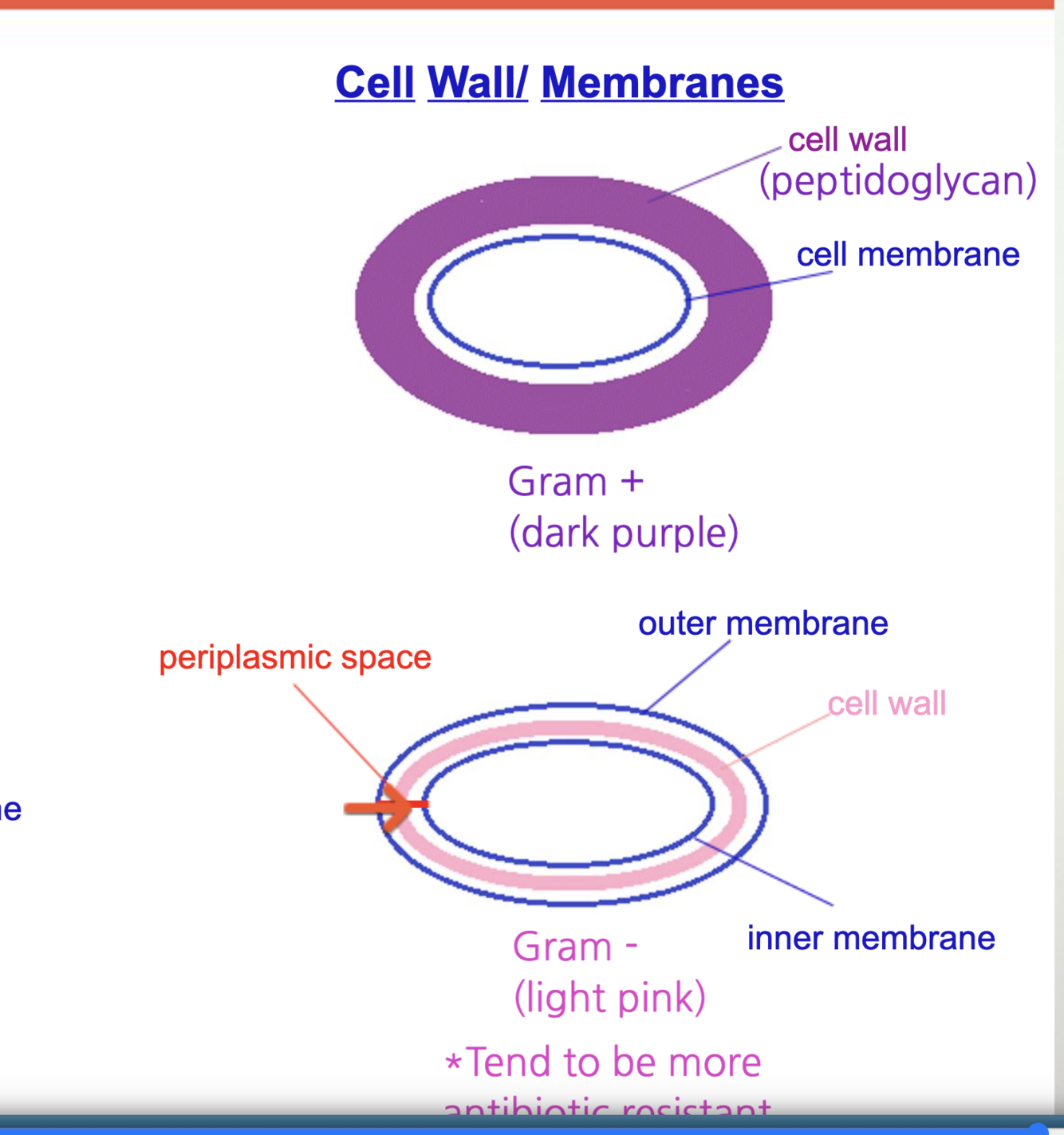 cell wall is btw two membranes outer membrane and inner membrane, so one thing that happens with gram negative bacterium tend to be more antibiotic resistant*** a lot harder for antibiotic to make it through two membranes we have shown here* so if you are readin a passage tells you particular pateint has bacteria infection given antibiotics not working what is the reason for this?….. describe scenario with gram negative or gram positive situation, it will be gram negative that most likely causes that particular infection because tends to be more antibitoic resistant*-
