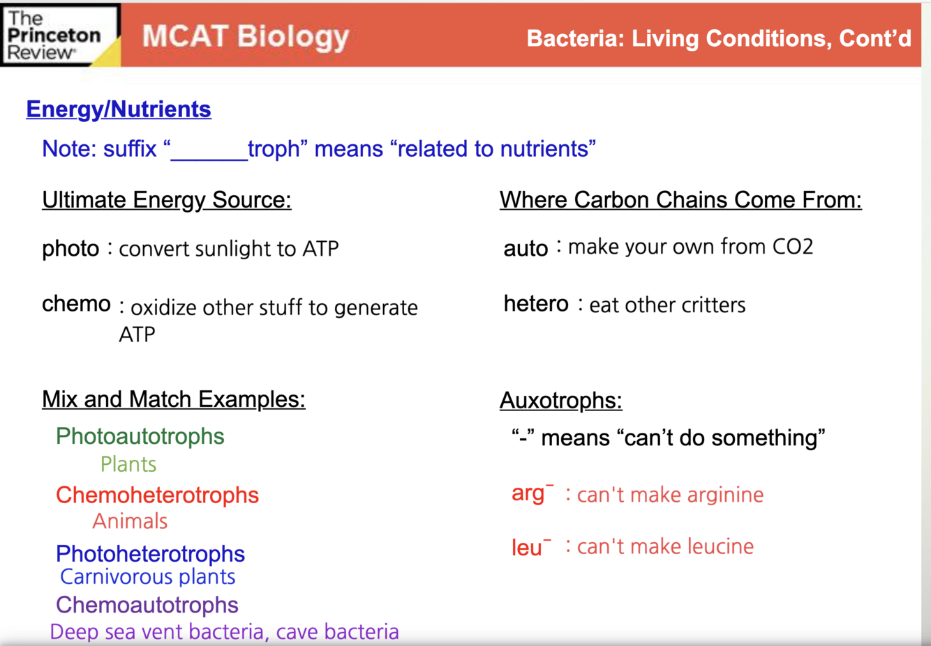 Autotroph – synthesizes its own food from inorganic substances (e.g., CO2, H2S, NH3)