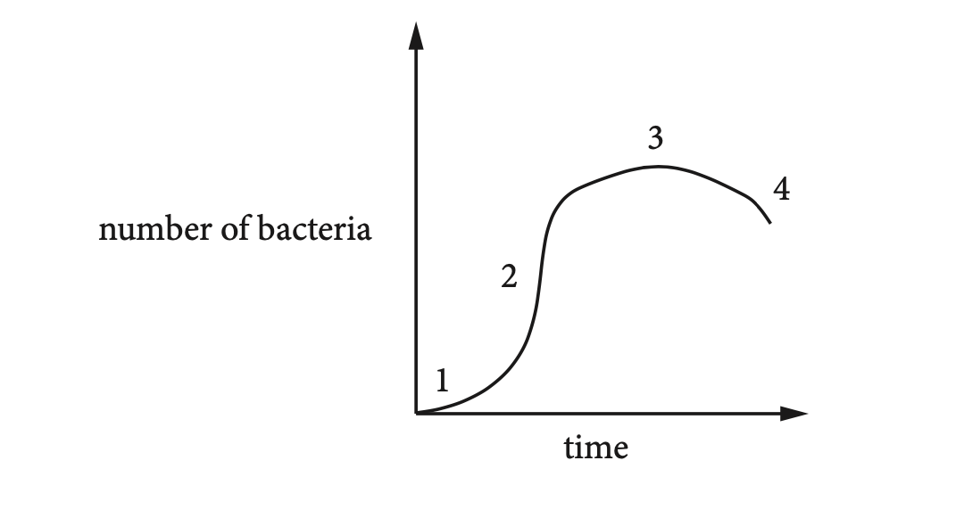 Growth kinetics have (1) lag phase, (2) exponential growth, (3) saturation, and (4) death