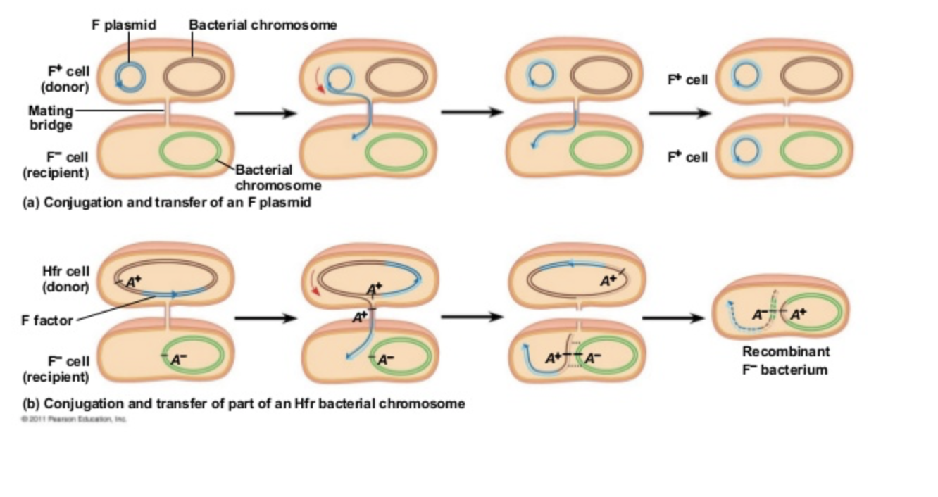 the plasmid has the genes required to build the mating bridg,e but there can also be other genes on F plasmid, most common example is gene for antiobitoic resistance, so if ever get question or passage abotu soemone who is becomign resistant to a certain antibtoic answer will be= conjugation, main mechnaism for antiobiotic resistance spreading in patients**