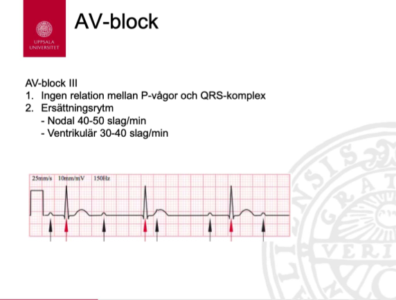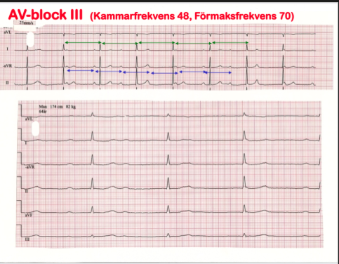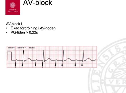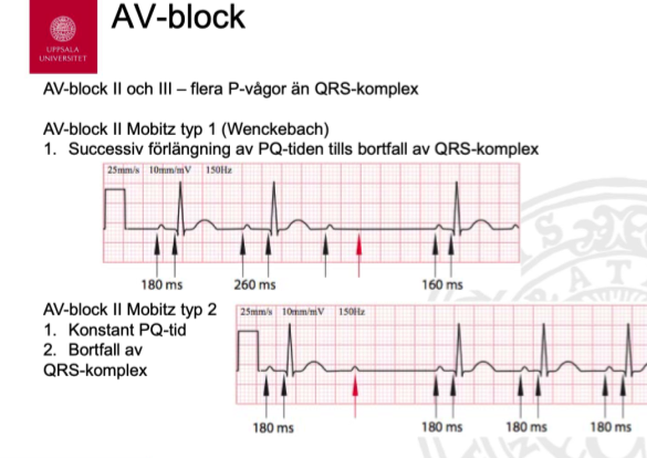 - Succesiv förlängning av PQ-tiden. Till slut P-våg utan QRS.