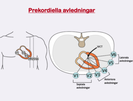 V1-v2 tittar på höger del av hjärtat och septum. Övriga avledningar vänster sida av hjärtat.