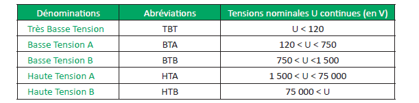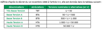 Suite au décret du 14 novembre 1988, Article 3-II, les courants ont été classés en 5 catégories données dans le tableau