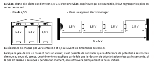 La f.é.m. d’une pile sèche est d’environ 1,5 V. Si c’est une f.é.m. supérieure qui est souhaitée, il faut regrouper les piles en série comme suit :