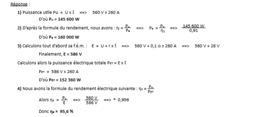 3) Calculez sa f.é.m. et sa puissance électrique totale.