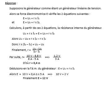 E.3 La différence de potentiel d’un générateur est U1 = 10 V quand il débite I1 = 5 A et U2 = 8,8 V quand il débite I2 = 8 A.