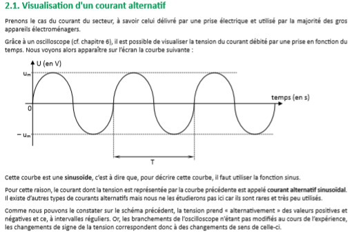 Grâce à un oscilloscope (cf. chapitre 6), il est possible de visualiser la tension du courant débité par une prise en fonction du temps. Nous voyons alors apparaître sur l’écran la courbe suivante :