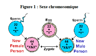 Il est déterminé au moment de la fécondation alors que les 23 chromosomes du spermatozoïde (contenant un chromosome sexuel X ou Y) se joignent aux 23 chromosomes de l’ovocytes (contenant un seul chromosome sexuel X) afin de former un zygote de 46 chromosomes (46 XX ou 46 XY).