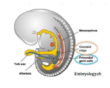 Entre la 4e et la 6e semaine de développement, les cellules germinales primitives, qui sont destinées à former les gamètes (ovules et spermatozoïdes), migrent de la vésicule vitelline vers les crêtes gonadiques (gonadal ridge), qui se trouvent de part et d’autre des canaux mésonéphriques et paramésonéphriques.