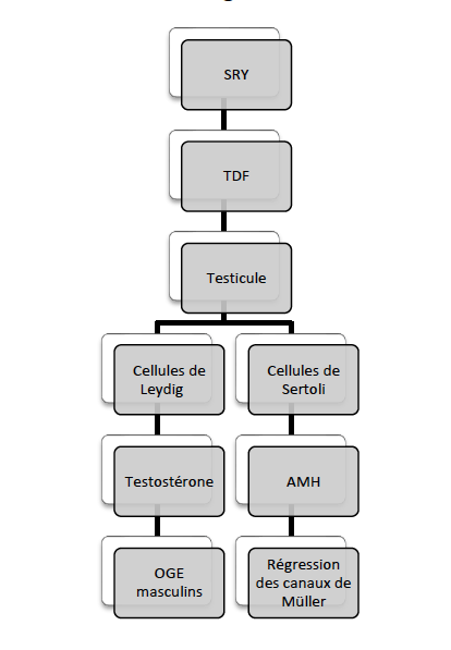 Durant la 7e semaine, sous l’influence du gène SRY (sex-determining region of the chromosome Y) situé sur le bras court du chromosome Y, une cascade génétique induit le développement de la gonade indifférenciée en testicule.