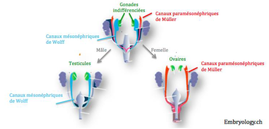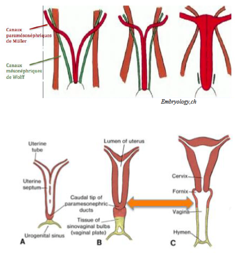 Chez l’embryon féminin, il n’y a pas de sécrétion d’AMH, vu l’absence de cellules de Sertoli. Il n’y a donc pas d’involution des canaux de Müller. Ces derniers se différencient durant la 9e semaine. Ils forment une structure en Y où chaque “bras” devient une trompe de Fallope, alors que la partie inférieure forme l’utérus, le col et le tier sup du vagin.