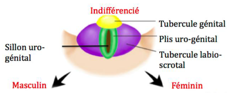 Contrairement aux OGI qui se forment à partir de canaux différents pour l’homme et la femme, les OGE se forment à partir de structures neutres et bipotentes : le tubercule génital, le sinus urogénital (issu du cloisonnement du cloaque) et les renflements/pli labioscrotaux.