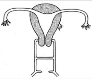 Une anomalie unilatérale résulte en un utérus dis “unicorne”, car la corne contralatérale est déficiente ou absente. Une corne déficiente appelée rudimentaire peut être constituée uniquement de myomètre, ou encore contenir de l’endomètre en son centre, ce dernier pouvant communiquer avec la cavité utérine ou en être isolé.
