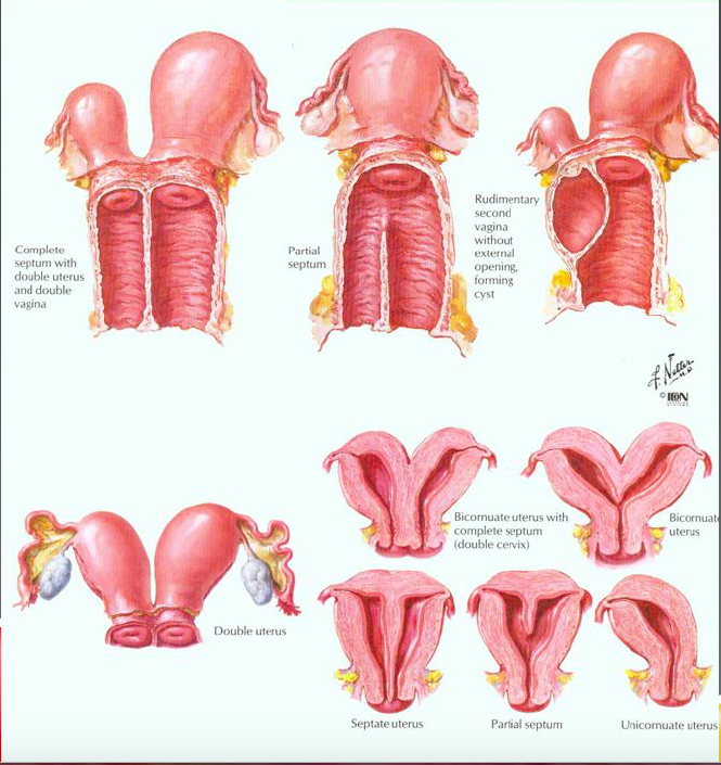 Avant la fusion complète de leur portion inférieure, les canaux de Müller droit et gauche sont d’abord séparés par un septum, qui se résorbe vers la 12e semaine par un processus de canalisation. L’absence de testostérone résulte en l’involution des canaux de Wolff vers la 10e semaine.