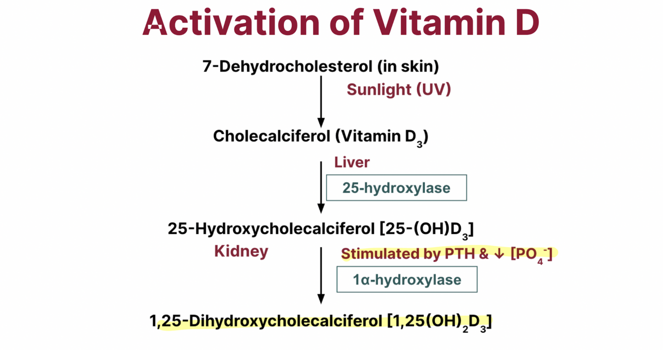 3. 25-HYDROXYCHOLECALCIFEROL is converted into 1,25-DIHYDROXYCHOLECALCIFEROL via 1a-hydroxylase in the KIDNEY (stimulated by PTH and low phosphate)