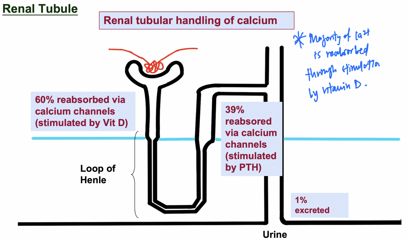 (3) PTH stimulates increased renal reabsorption of Ca2+ (60% stimulated by vitd at glomerulus, 39% stimulated by PTH at collecting ducts)