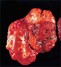 -variegated areas of necrosis, hemorrhage, and cystic change