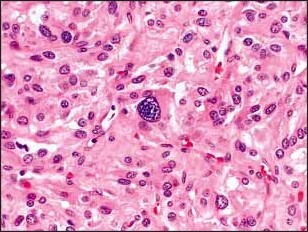 *nests of polygonal or spindle-shaped cells, surrounded by vascular network