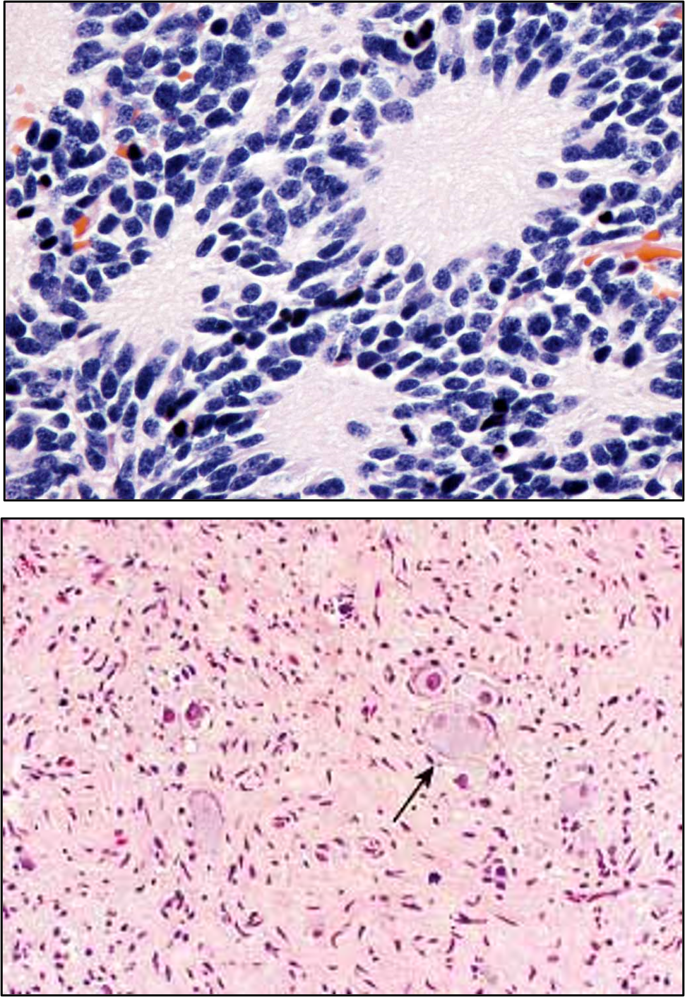 *“pseudorosettes” of small blue cells (dark nuclei arranged around fibrillary material)