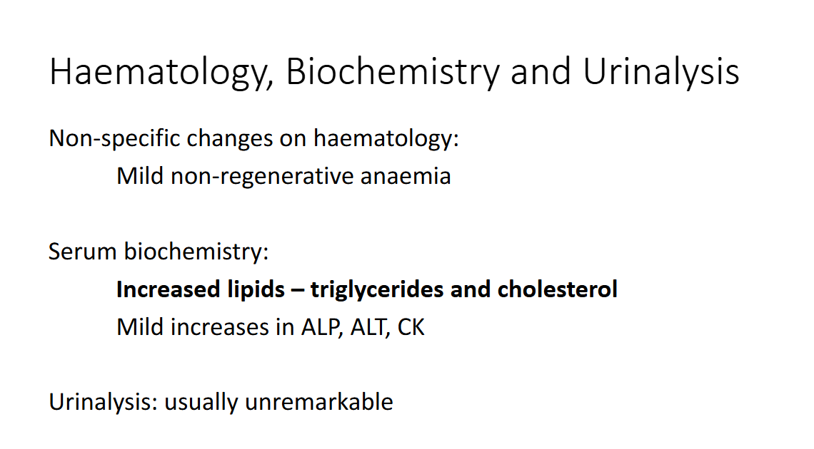 describe changes you might see on haematology, serum biochem, and urinalysis for hypothyroid?