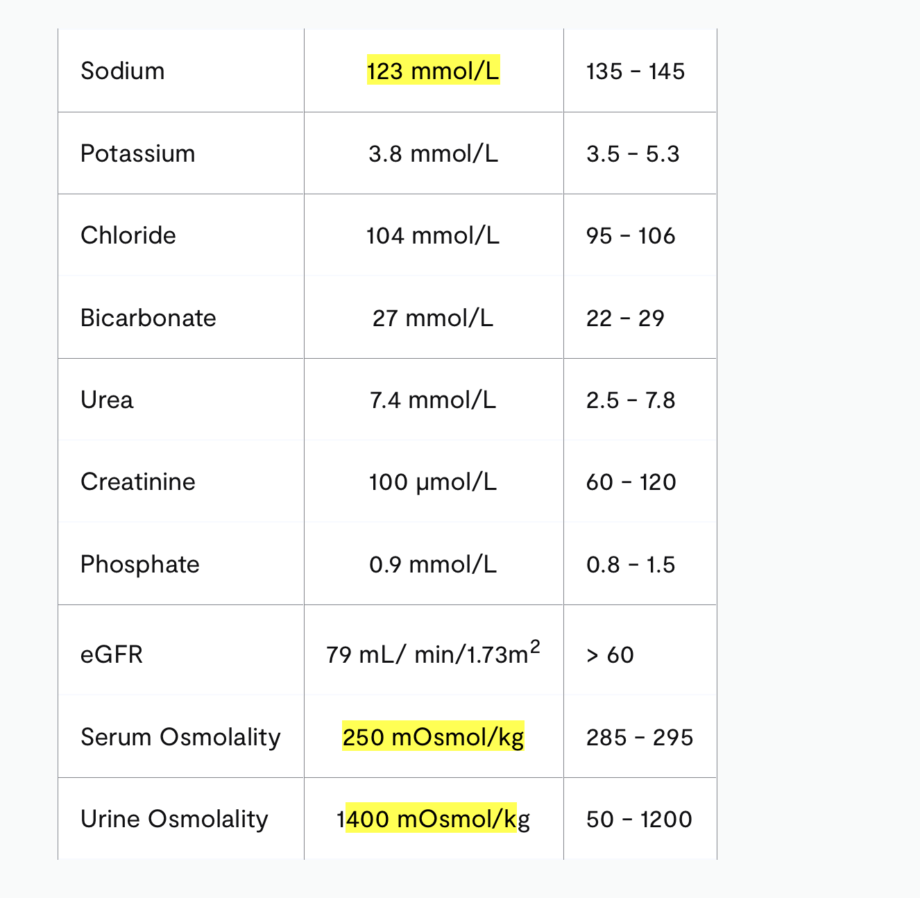 This patient’s symptoms are consistent with hyponatraemia and this is evidenced by the low serum osmolarity and the low sodium in the blood results. A common cause of hyponatraemia is the use of sulphonylureas due to Syndrome of Inappropriate Antidiuretic Hormone (SIADH).