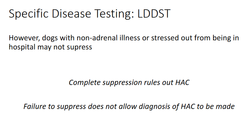 -describe the results youd expect in low dose dex supression testing for hyperadrenocorticism, along with its limitations