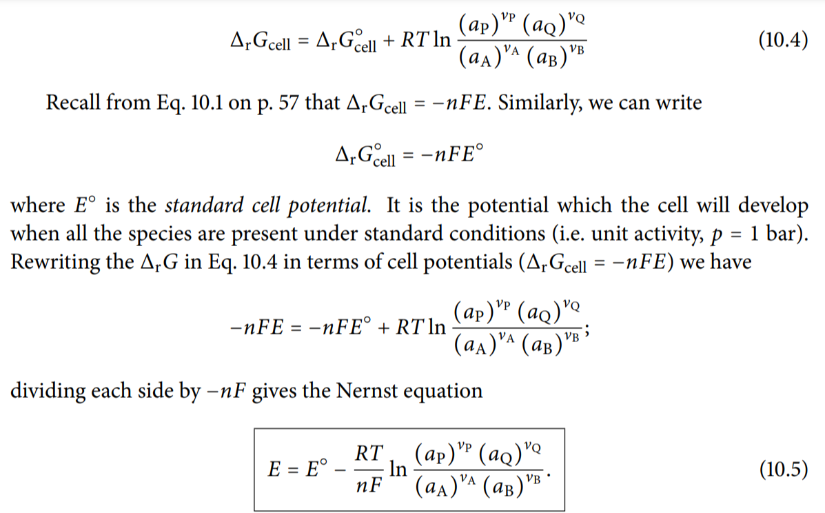 E = Eo - (RT/nF)ln( ((ap)Vp(aQ)VQ) / (aA)VA(aB)VB) )