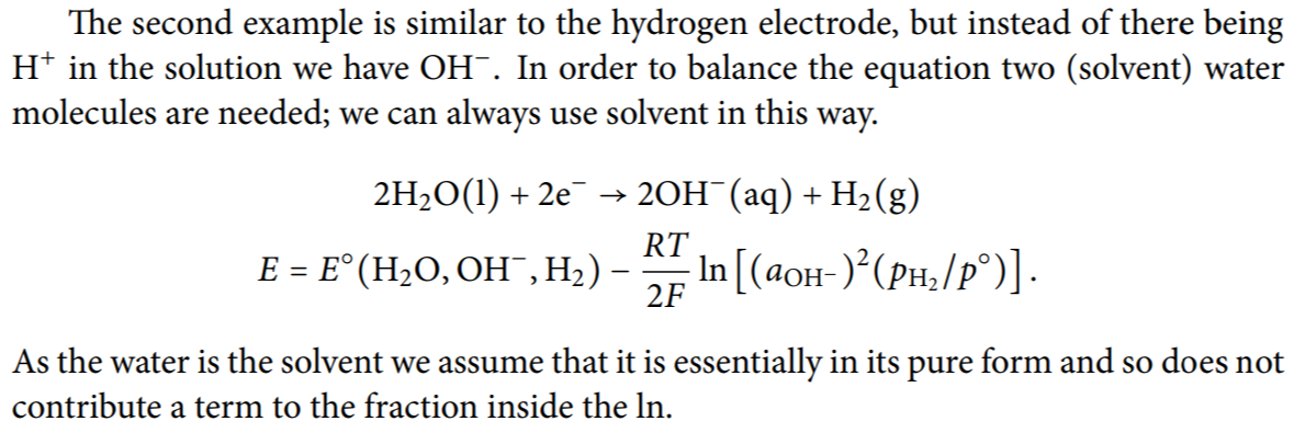 A gas/ion half-cell involves H2(g) and OH-(aq). Write the conventional cell reaction and the Nernst equation.