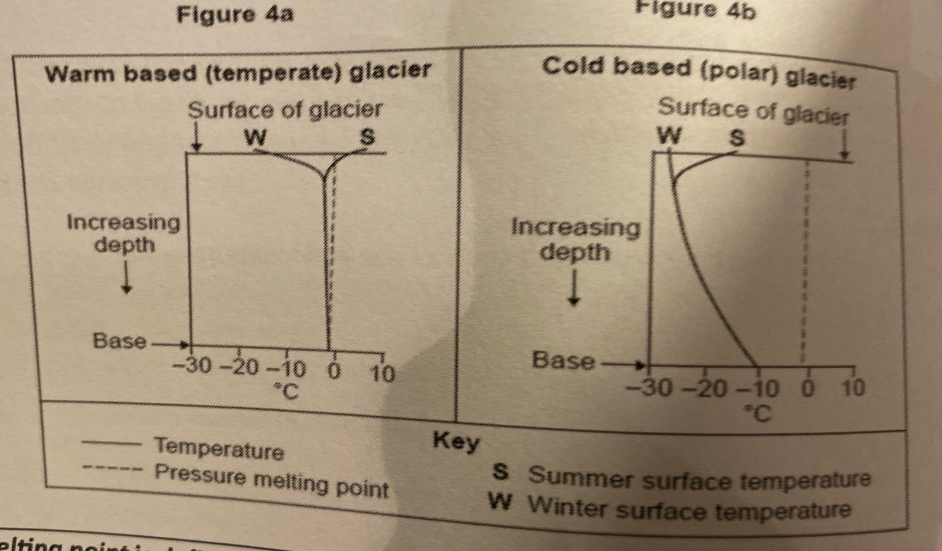 - this melt water causes them to melt continually —> basal ice (ice at bottom of glacier)