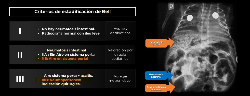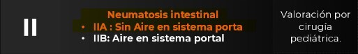 Estadio ll B de Bell : neumatosis + gas en sistema venoso intrahepático