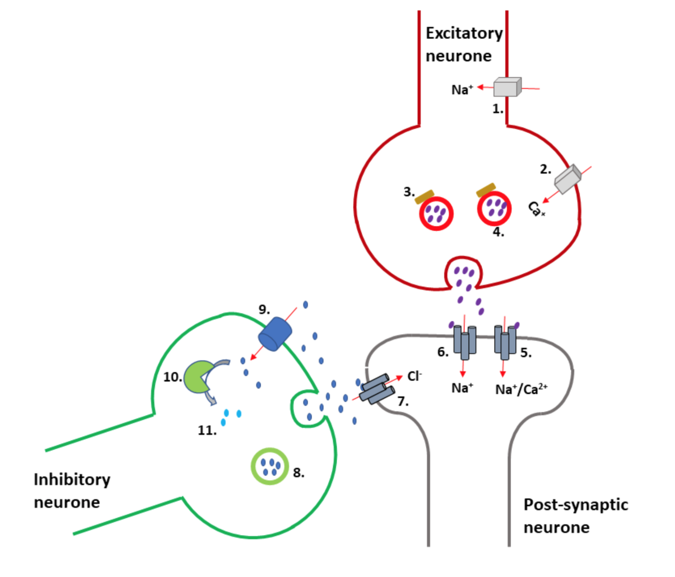AMPA receptor, GABA receptor, GABA reuptake transporter, GABA transaminase, GABA vesicle, glutamate vesicle, NMDA receptor, succinic semi-aldehyde, synaptic vesicle protein, VG Na+ channel, VG Ca2+ channel