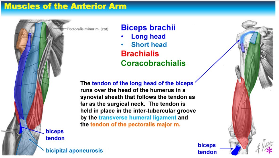 Other two muscles are the coracobrachialis (deep to the bicep, goes from coracoid process to humerus) and the brachialis muscle
