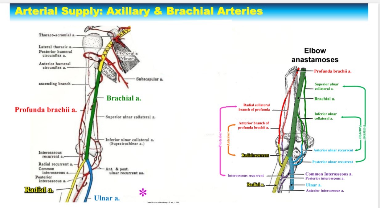 Then once the brachial artery crosses the elbow, it branches into the ulnar and radial arteries
