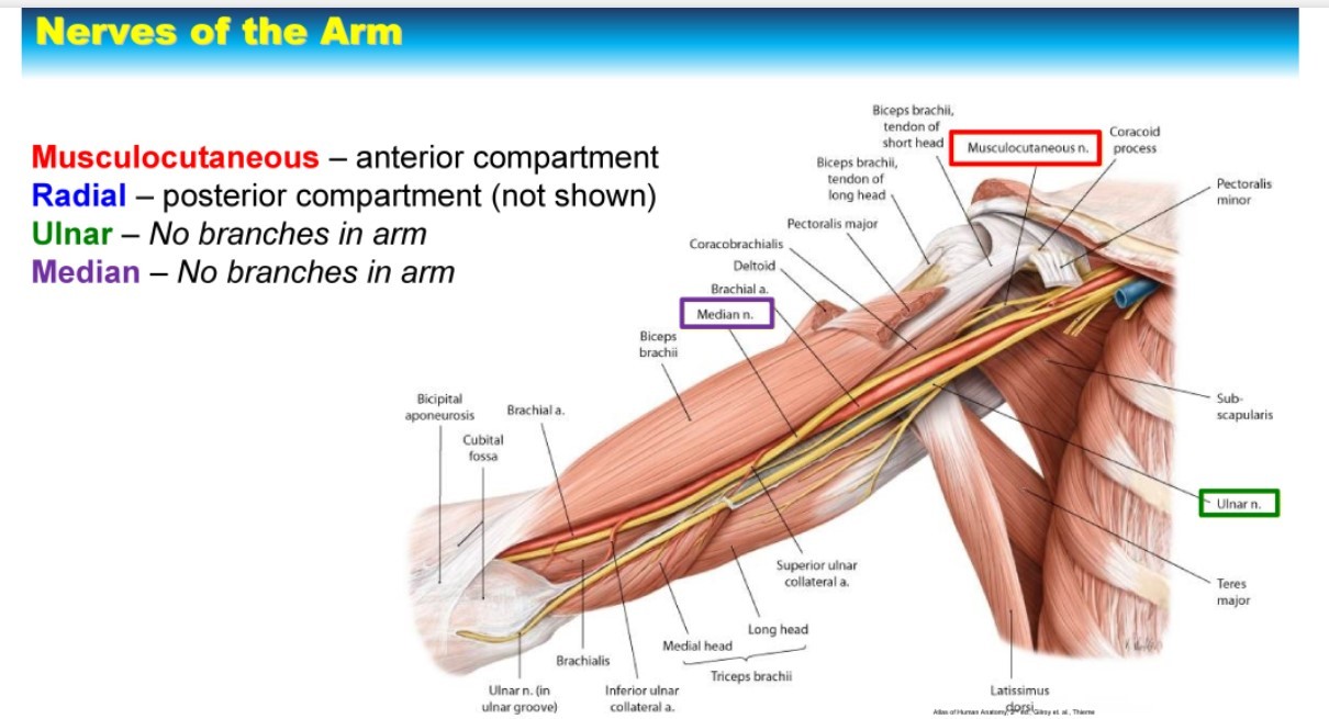 Medial nerve: no branches in the arm, but it does pass through the cubital fossa deep to the bicipital aponeurosis