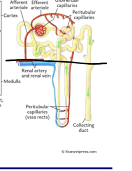 ◦ Juxtamedullary nephrons: located near cortex/medulla junction, efferent arterioles give rise to long straight capillaries (vasa recta) that descend into renal medulla. Extremely long loops of henlee ( critical for urine concentration)