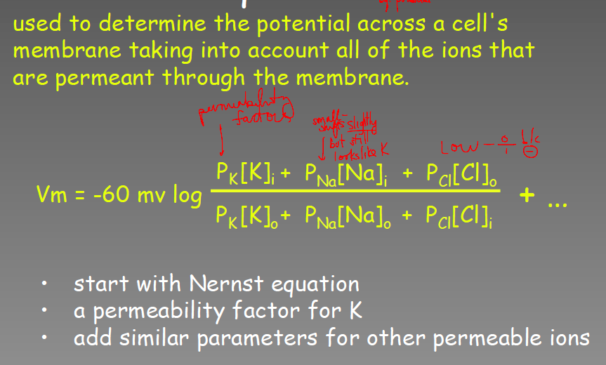 used to determine the potential across a cell’s membrane taking into acct all of the ions that are permeant