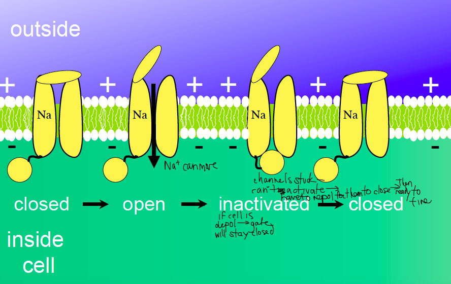 closed - open (Na in) - inactivated (stuck and can’t activate - have to repolarize to open) - closed
