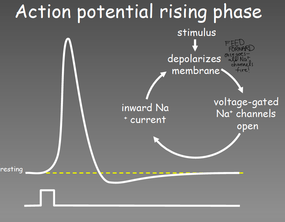 stim –> depol membrane –> Na channels open –> inward current –> depol mem further